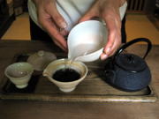 茶葉とお湯の線が同じになれば均等に湯呑に注ぎます。